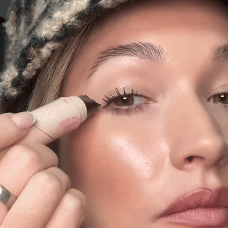 - Stempel ansetzen: Den Eyeliner-Stempel am äußeren Augenwinkel platzieren.